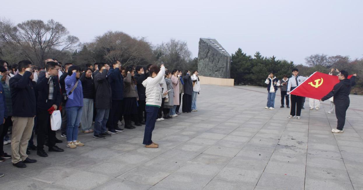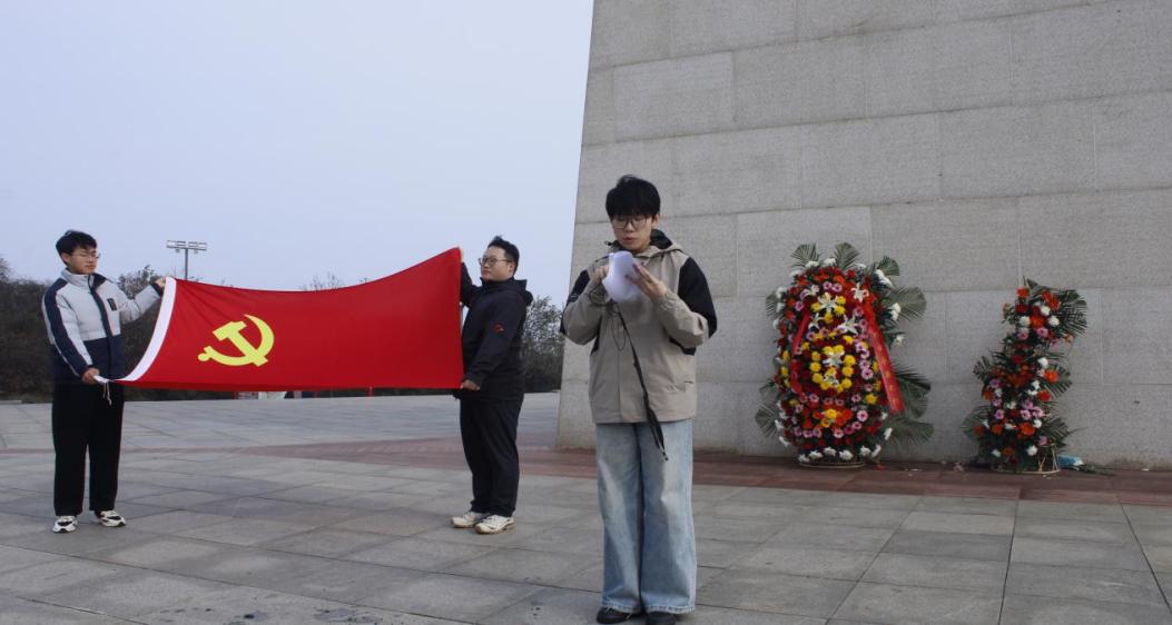 随后,全体人员在百团大战纪念碑广场举行了缅怀先烈仪式。在庄严肃穆的氛围中,肃立默哀30秒,以表达对革命先烈的深切缅怀。学生代表项鹏宇同学发言,坚定地表达了继承先辈遗志、坚守理想信念的决心。教师代表向纪念碑敬献花篮,以此寄托对英烈的深切哀思与崇高敬意。全体党员同志重温入党誓词,铿锵誓言在纪念碑前激扬回荡。